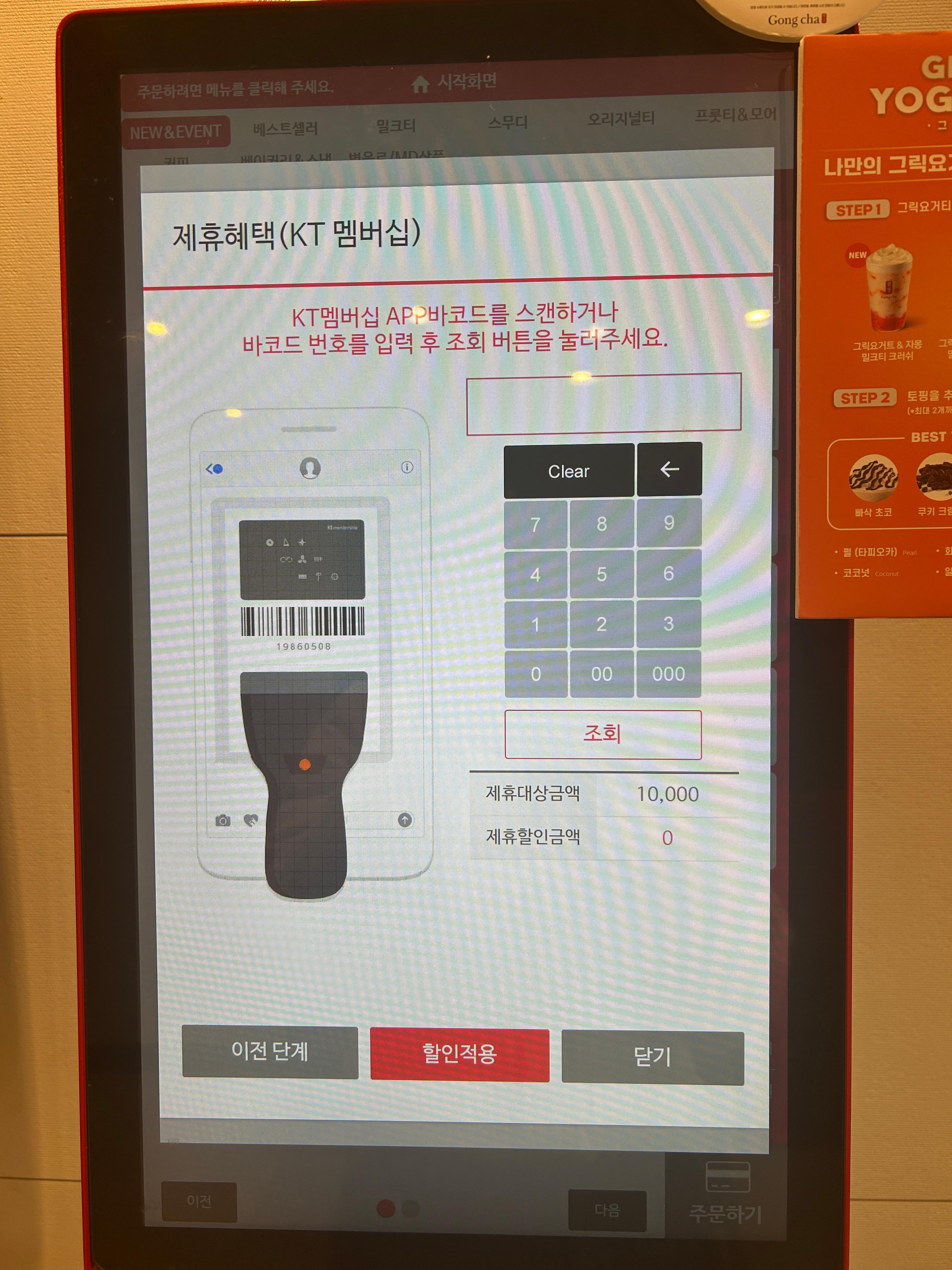 멤버십 바코드를 입력하면 자동으로 음료 할인이 들어가게됩니다.